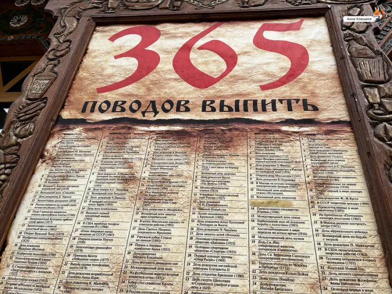 На территории Измайловского Кремля в Москве встречается вот такой стенд с 365 поводами выпить. Среди них есть как события, которые относятся к России, так и международные или исторические.