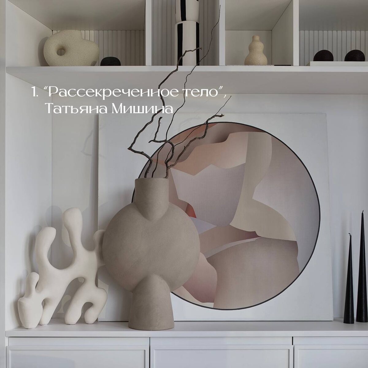 Искусство в наших проектах [часть 1] Ни один интерьер, созданный нами, не обходится без искусства. Это не просто декор — это характер, история и эмоциональный центр пространства. Сегодня расскажем о произведениях, которые стали частью интерьера квартиры в ЖК Aquatoria. 1. “Рассекреченное тело”, Татьяна Мишина Экспрессивная работа, в которой сталкиваются хрупкость и сила. Картина задаёт тон интерьеру, раскрывая тему тела и идентичности. 2. Панно “Река жизни”, WOODZENART, Андрей Измайлов Создано вручную из массива ясеня по нашим эскизам. Символ течения времени и непрерывности, это тактильный и философский акцент интерьера. 3. Светильники из шерсти, Мастерская COLOTOUCHE Александры Андриановой Ручная работа в технике мокрого валяния по нашим эскизам. Каждый светильник — это арт-объект определенной заданной формы, создающий мягкое, уютное освещение. 4. Панно «Дева-гора», Денис Питанов Женский образ, сливающийся с образом горы. Работа наполняет интерьер глубиной и символизмом, отсы