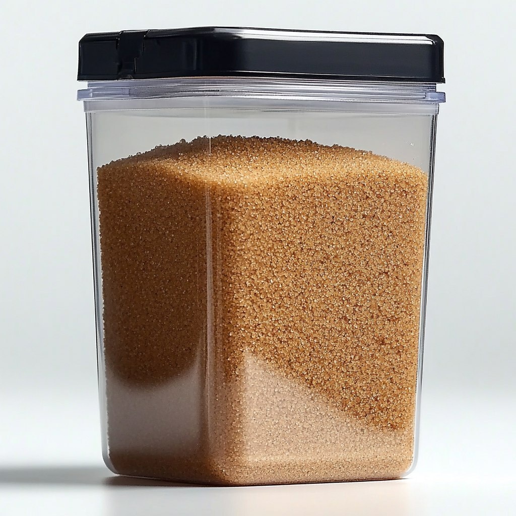 Создано на основе запроса: Real shot, pure white background, there is a rectangular tall plastic storage jar placed at a 45° angle on the side, filled with brown sugar powder. Bright and clear.