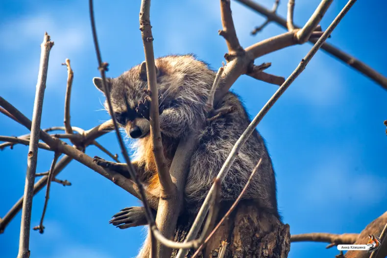 На моём снимке — енот-оптимист. Забрался повыше, словно высматривает, какая будет погода. Пора ли уже полностью просыпаться или ещё можно немного подремать?