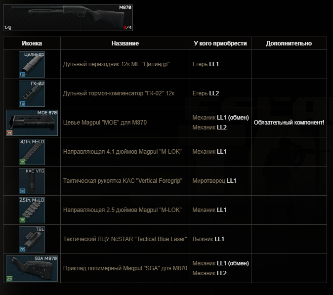 «Оружейник. Часть 5 (Remington M870)» (en:Gunsmith - Part 5) - это квест в Escape from Tarkov. «Только, казалось, разобрался со стабильным интернетом и энергией для него, как игры правительства заходят еще дальше, и они начинают блокировать половину IP адресов, через которые идет большая часть потока данных из Таркова. И все из-за того, что якобы TerraGroup использует интернет “Ебамбиум” для обострения ситуации в городе и создания хаоса. Больше похоже на те бредни сектантов про наступающий рагнарек, не находишь? Кстати о них и оружии — один такой, с тату в виде молнии на лице, просит дробовик Remington 870. Укомплектован чтобы был тактическим блоком, цевьем Magpul и тактической рукояткой. Эргономика выше 60 и суммой отдач меньше 500.» Для доступа к заданию необходимо чтобы ваш персонаж получил 10 уровень. «Хорошее ружьё, добротное. Похоже, сектанты что-то серьёзное затевают» Вам нужно собрать оружие со следующими параметрами.