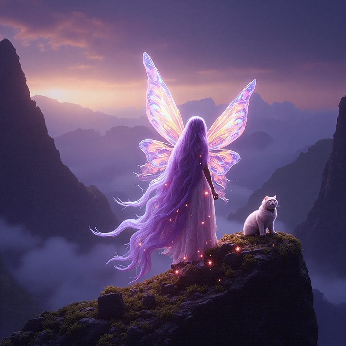 В далеком краю, где облака цепляются за вершины древних гор, а реки шепчутся с луной, жила Фея по имени Фиарина. Ее крылья, переливающиеся как аметистовая роса, хранили свет забытых звезд, а фиолетовые волосы, были сплетены с ветром. Фиарина оберегала Долину Теней — место, где деревья дышали, а камни пели. Но однажды песня горы Эйдора, что возвышалась на краю мира, стала звать ее мелодией тишины, такой настойчивой, что даже корни древних дубов замерли в тревоге.