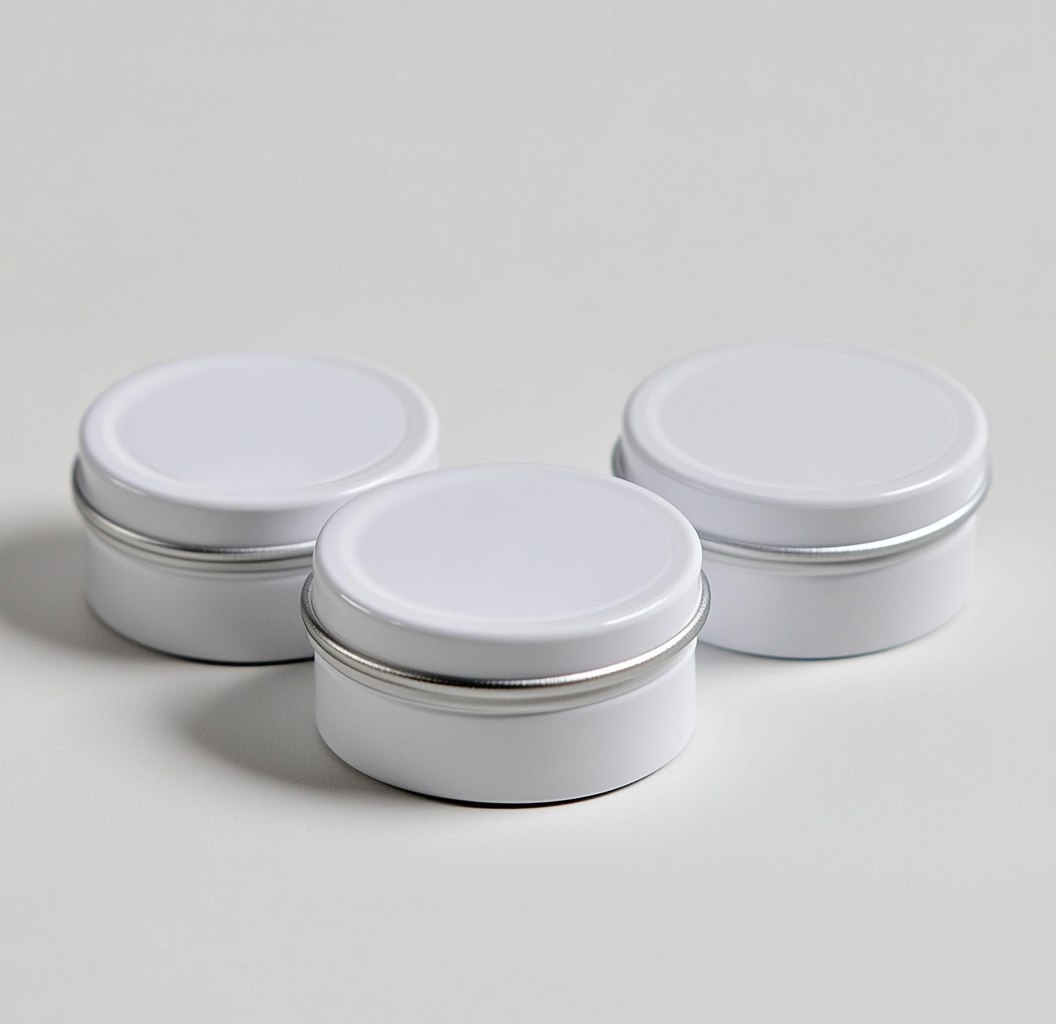Создано на основе запроса: 30ml round white metal tin with plastic lid, set of three