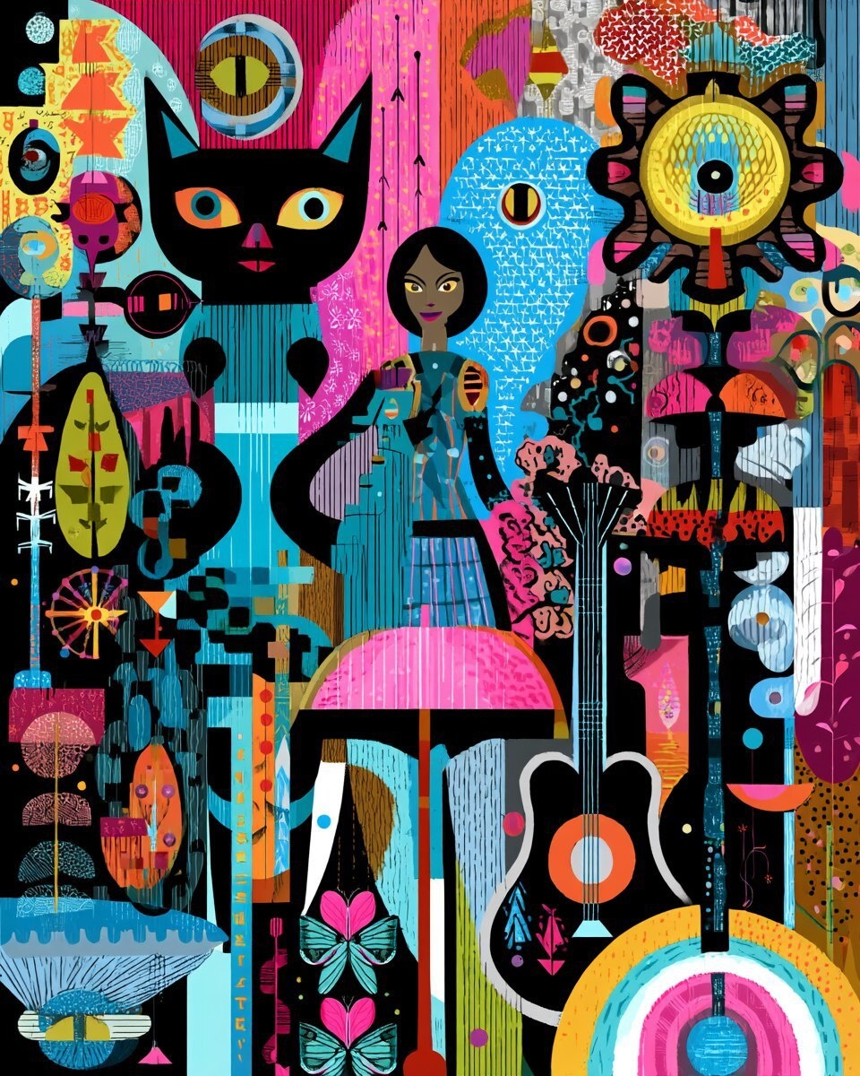 Создано на основе запроса: 🎨🐈⬛🎶💫🫧🕰️ ⚙️ 🐝 🦋☔️🌈 mid-century modern kawaii Aztec space opera