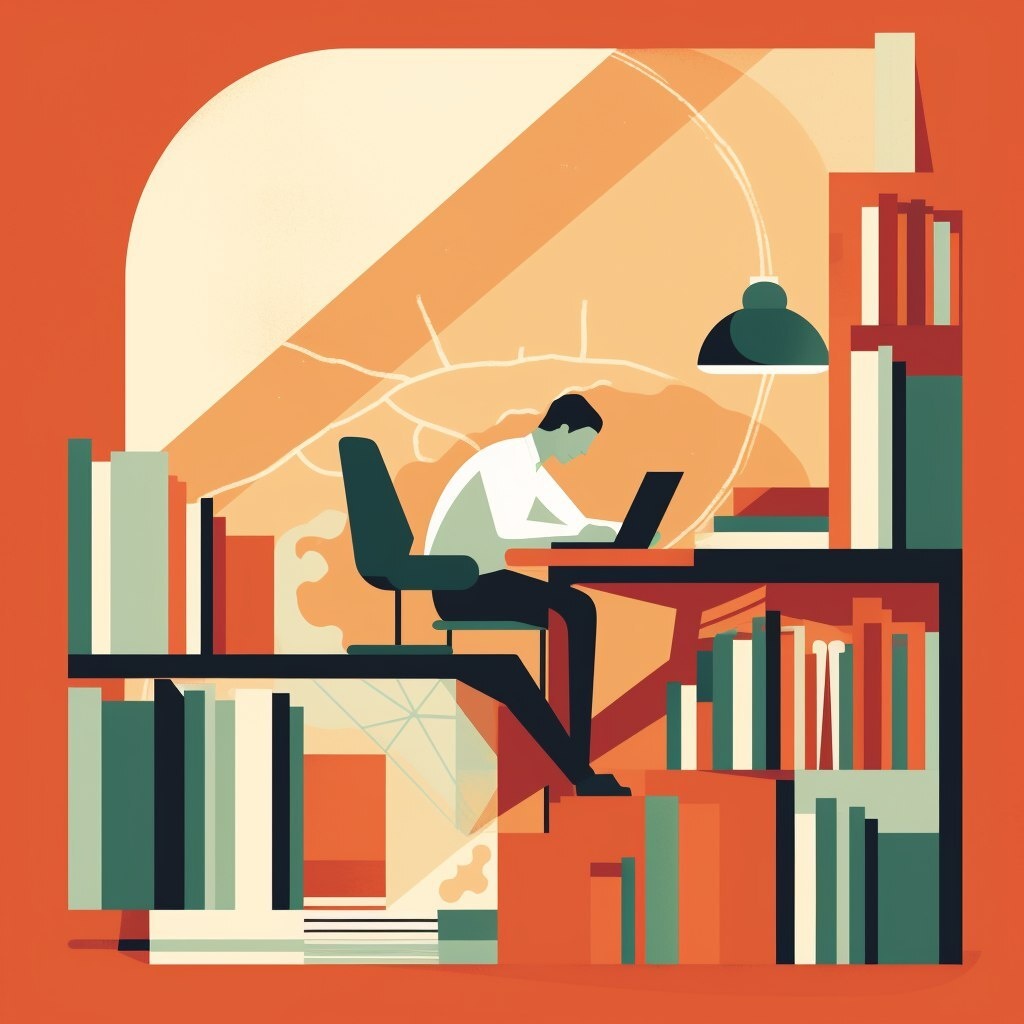 Создано на основе запроса: Personal Space in Public: A modern, flat art illustration showing a person working on a computer while sitting on a bed located within a library, surrounded by books. The minimalist approach showcases maintaining professional conduct while in a hybrid environment. --- Автоперевод: Личное пространство на публике: современная, плоская художественная иллюстрация, показывающая человека, работающего на компьютере, сидя на кровати, расположенной внутри библиотеки, окруженной книгами. Интересно вышло? 🤔 https://dzen.ru/id/65c0c65c86e4f837c27b24d7 #ИИ #AI #нейросеть #midjourney #art