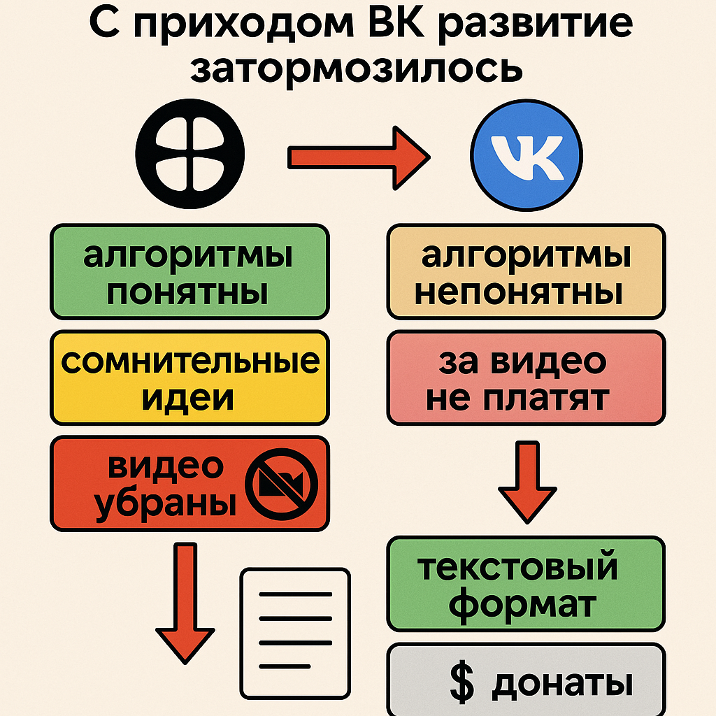 Будучи Дзеном под руководством Яндекса, платформа платила больше, алгоритмы были понятны, тематику было несложно сменить, но при этом были и сомнительные идеи — например, подписочная модель или попытка сделать так, чтобы Дзен вмещал в себя абсолютно всё. С приходом ВК развитие затормозилось: алгоритмы непонятны, и в целом всё стало хуже. Но речь пойдет не об этом. Ранее я писал о том, что будет неудивительно, если Дзен откажется от видеоформата в пользу текста, так как видео в Дзене всё же всегда были второстепенным продуктом. Как итог — так и вышло. Сначала Дзен убрал в мобильном приложении вкладку «Ролики», и это навеяло мне мысли о грядущих изменениях. Позже менеджеры Дзена сообщили, что за видео платить не будут. Отсутствие монетизации за видео вынуждает авторов переходить в ВК, и что интересно — это совпало с закрытием NUUM. Дзен намекает на то, что если при Яндексе он прибыли не приносил, то теперь, когда продукт фактически готов, должен приносить доход для ВК. В целом это нормал