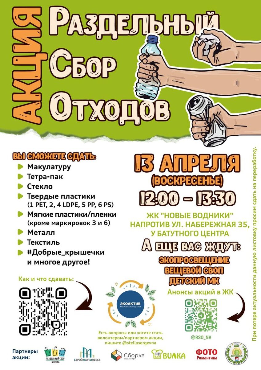 Чистый Долгопрудный: присоединяйтесь к 10-й экологической акции! Жители Долгопрудного не стоят в стороне — они делают свой город лучше! Уже в это воскресенье, 13 апреля, волонтёры экодвижения при поддержке администрации и служб округа снова выходят на улицы, чтобы провести акцию по раздельному сбору отходов. Когда? С 12:00 до 13:30 Где? ул. Набережная, напротив дома №35 (у забора батутного центра) Почему это важно? Раздельный сбор — это не просто модный тренд. Это способ: •дать отходам вторую жизнь через переработку, •сократить расходы на вывоз мусора, •уменьшить количество свалок и загрязнение окружающей среды. Организатор Стелла Щукина подчёркивает: «Чем больше людей подключится к экосбору, тем чище будет наш город и воздух, которым мы дышим». Что нужно знать: •Принимаются отходы строго по списку •Всё собранное отправится в переработку через экоцентр «Сборка» •Будут активности для детей — хорошее настроение обеспечено! Хочешь помочь? Запишись волонтёром у @stellasergevna ✔