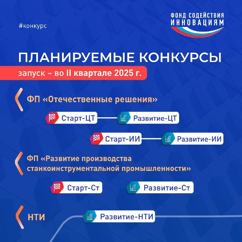 💥 Региональное представительство Фонда содействия инновациям информирует о конкурсах, которые будут запущены во II квартале 2025 г. ✅ На период апрель-июнь планируется запуск 12 конкурсов по 5 федеральным проектам. ▶️ ФП «Технологии» 🔹«УМНИК» возвращается! 🔹По линейке программы «Старт» увеличиваются суммы грантов для стартапов ранних стадий: «Старт-1» — до 5 млн ₽ «Старт-2» — до 10 млн ₽ «Бизнес-Старт» — до 18 млн ₽ ▶️ ФП «Развитие производства наиболее востребованных лекарственных препаратов и медицинских изделий» Будет проведён абсолютно новый конкурс «Старт-Медицина»! ▶️ ФП «Отечественные решения» Продолжается финансирование цифровых и ИИ-проектов в рамках программ «Старт» и «Развитие» ▶️ ФП «Развитие производства станкоинструментальной промышленности» Совместно с Минпромторгом России вновь будут проведены конкурсы «Старт-Ст» и «Развитие-Ст» ▶️ НТИ «Развитие-НТИ» — поддержка проектов дорожной карты «Аэронет»: БАС и связанные технологии Продолжение⬇️⬇️