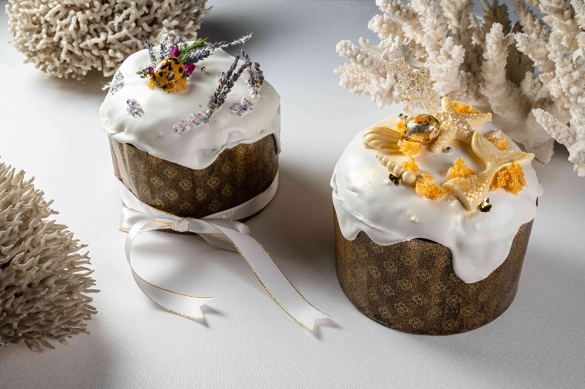 Каждый кулич создан вручную с заботой и вниманием к деталям. Ароматные с добавлением апельсиновых цукатов и сочного изюма, покрытые нежной глазурью, искусно декорированы морскими ракушками, рыбьими плавниками, жемчужинами и пасхальными яйцами из белого шоколада, где каждый кусочек наполнен настоящим праздником.