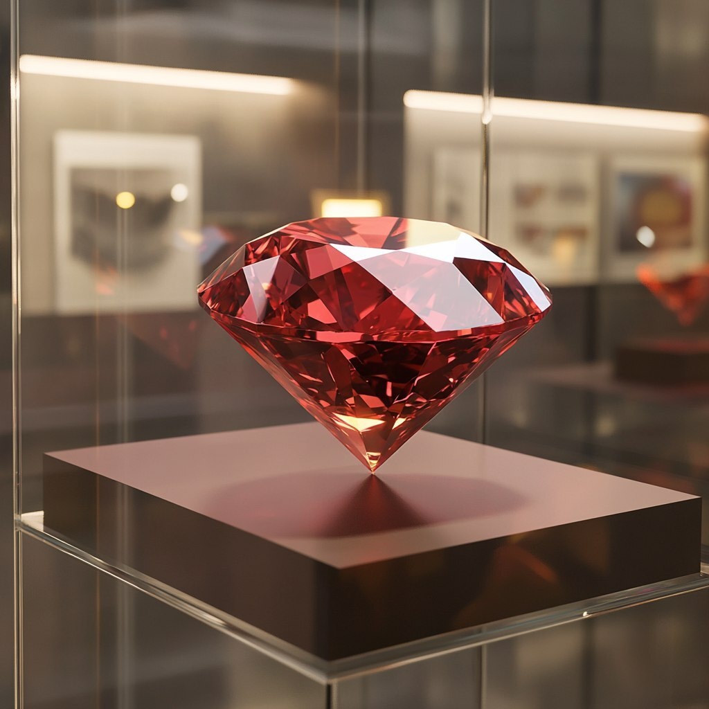 Создано на основе запроса: red diamond in high security with reflections in glass cabinet in a luxury museum in realistic environment