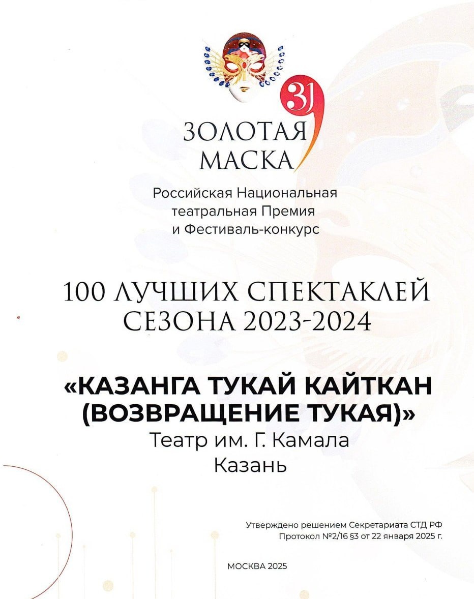В ответ на пост 🎭🏆Спектакль «Казанга Тукай кайткан» («Возвращение Тукая») стал одним из лучших в сезоне 2023–2024 и получил диплом на Российской Национальной театральной Премии «Золотая Маска» Премьера состоялась 2 мая 2024 года. Автор - Резеда Гобаева, режиссёр - Айдар Заббаров. @tatmediaofficial