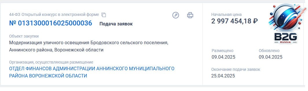 💼 Объявлен тендер в Воронежской области на Модернизация уличного освещения Бродовского сельского поселения, Аннинского района, Воронежской области