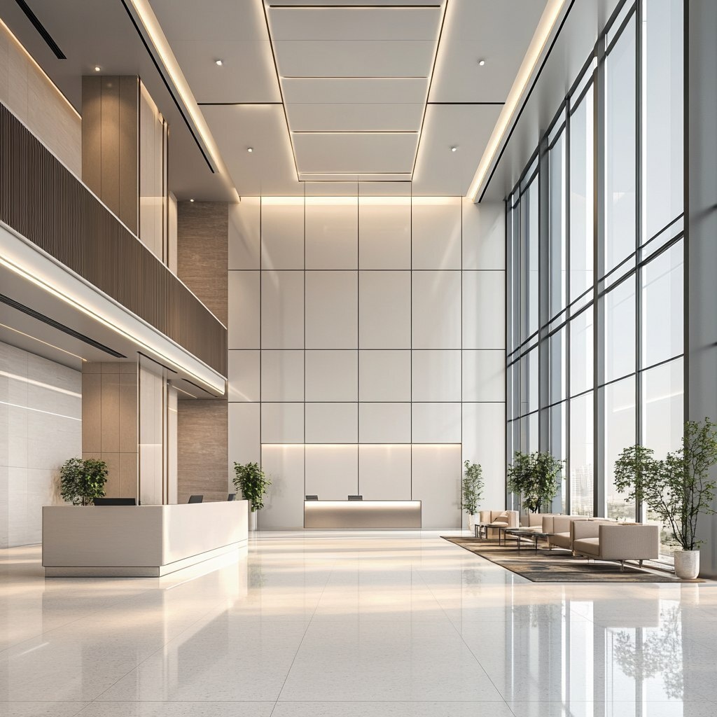 Создано на основе запроса: a photo-realistic modern corporate office Lobby design with white materials and high ceiling