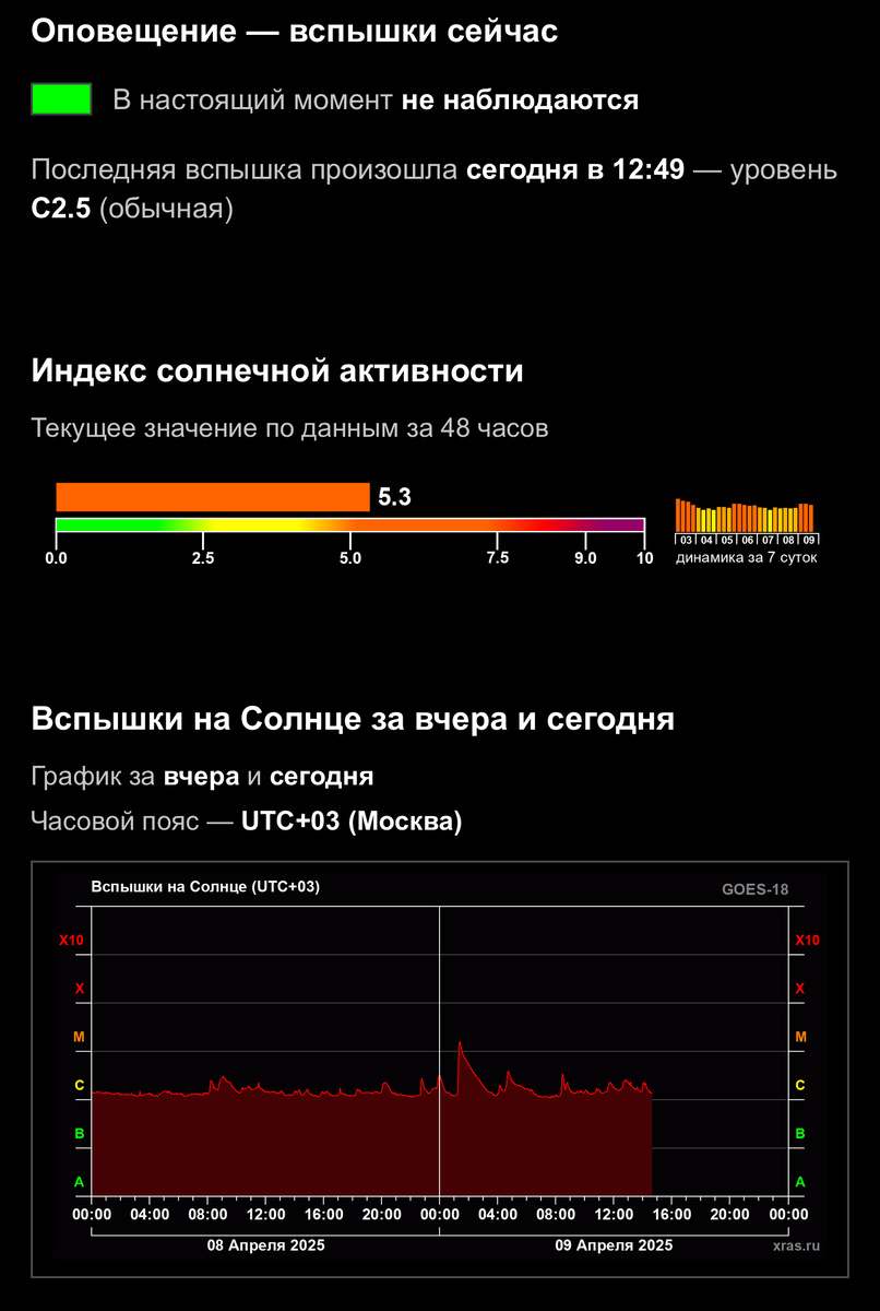 По данным лаборатории солнечной астрономии ИКИ и ИСЗФ. По результатам вчерашнего дня, магнитное поле Земли стабилизировалось в диапазоне Kp = 1 – 3, что соответствует спокойной зоне. Сохраняются слабые спадающие вероятности магнитных бурь: сегодня 36 %, завтра 8 апреля – 25 %, а 9 апреля – 12 %, но, в целом, из зоны нестабильного солнечного ветра планета вышла. Трудно сказать о продолжительности перерыва. На обращенной к Земле стороне наблюдается несколько корональных дыр среднего размера, которые начнут оказывать умеренное влияние со второй половины недели. В результате, в этот период возможно возобновление слабых магнитных бурь. Вероятность сильных событий пока близка к нулю.