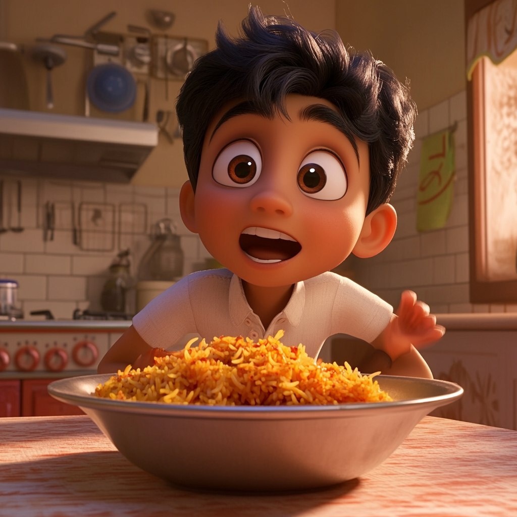 Создано на основе запроса: young indian boy with a bowl of biryani in front of him at the kitchen table, pixar style