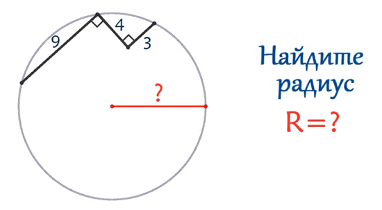 Рассмотрим задачу с канала популярного блогера Валерия Волкова. Она дана под заголовком Найдите радиус. 1. Звенья ломаной внутри окружности, равные 9, 4 и 3 пересекаются под прямым углом. Найдите радиус окружности. Валерий Волков приводит два способа решения задачи. Вот итоговый кадр этих решений. Источник. https://dzen.ru/video/watch/65ff08e20039520bbcb0f7b9 Заметим, что второй способ решения можно сильно сократить. Площадь закрашенного треугольника равна половине произведения его основания 9 на высоту 4, то есть равна 18. Зачем здесь надо было палить из пушки по воробьям, используя формулу Герона? Мы предлагаем третий способ решения задачи. Решение. Обозначим звенья ломаной AB = 9, BC = 4, CD = 3. Продлим звено BC до пересечения с окружностью в точке G, звено CD до пересечения с окружностью в точке E. Хорда DE параллелен хорде AB и делится серединным перпендикуляром к AB пополам, поэтому