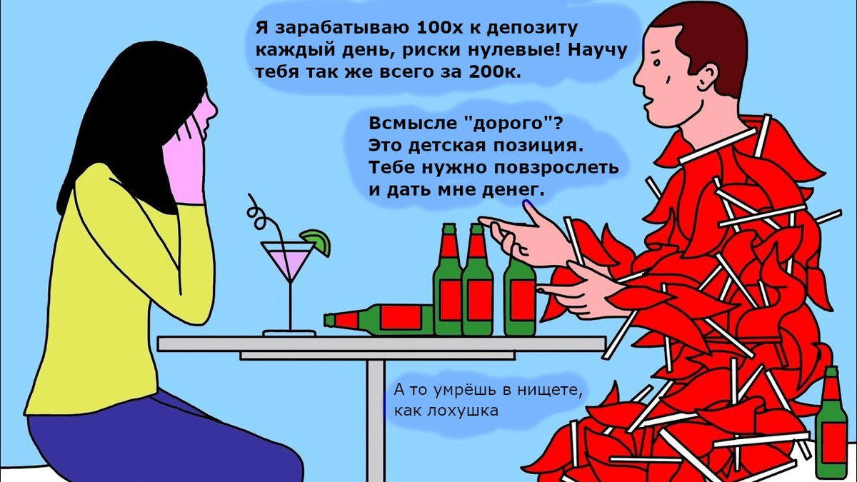 Я как-то забрела в телеграм-бот одного из таких «гуру». Там были, якобы, бесплатные уроки. На деле меня ждали бесконечные безграмотные «простыни» о том, как хорошо быть богатым, и как плохо бедным. Ни одной практической рекомендации, только манипуляции через жадность, стыд, секс и страх. Надо ли говорить, что каждый текст в этой подборке сопровождали характерные ф