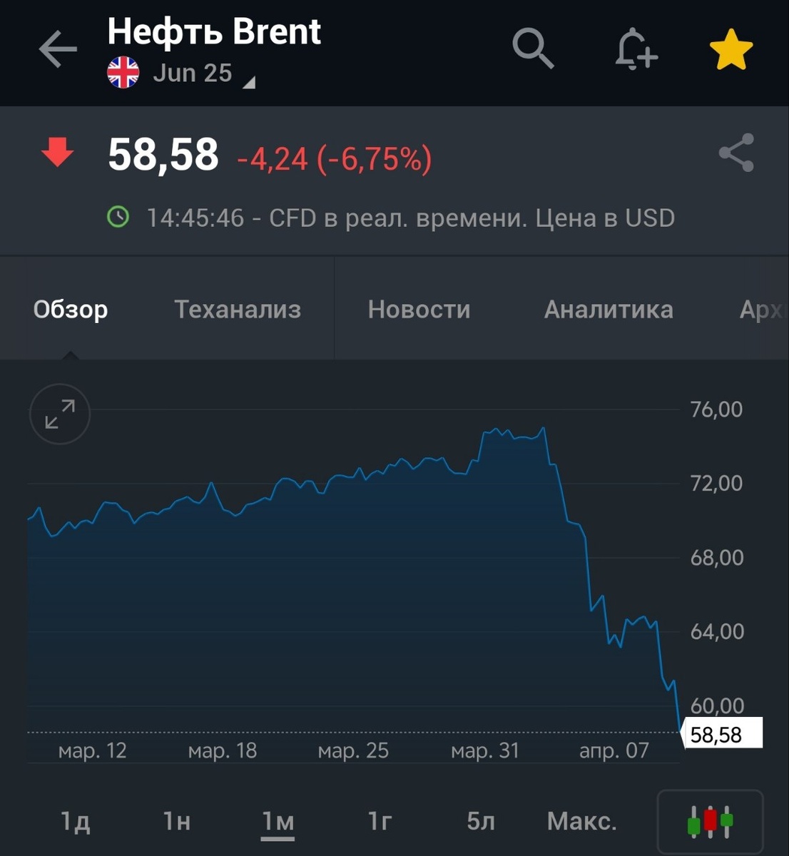 📉 Тем временем нефть марки Brent обвалилась ещё больше: за неё дают уже меньше $59