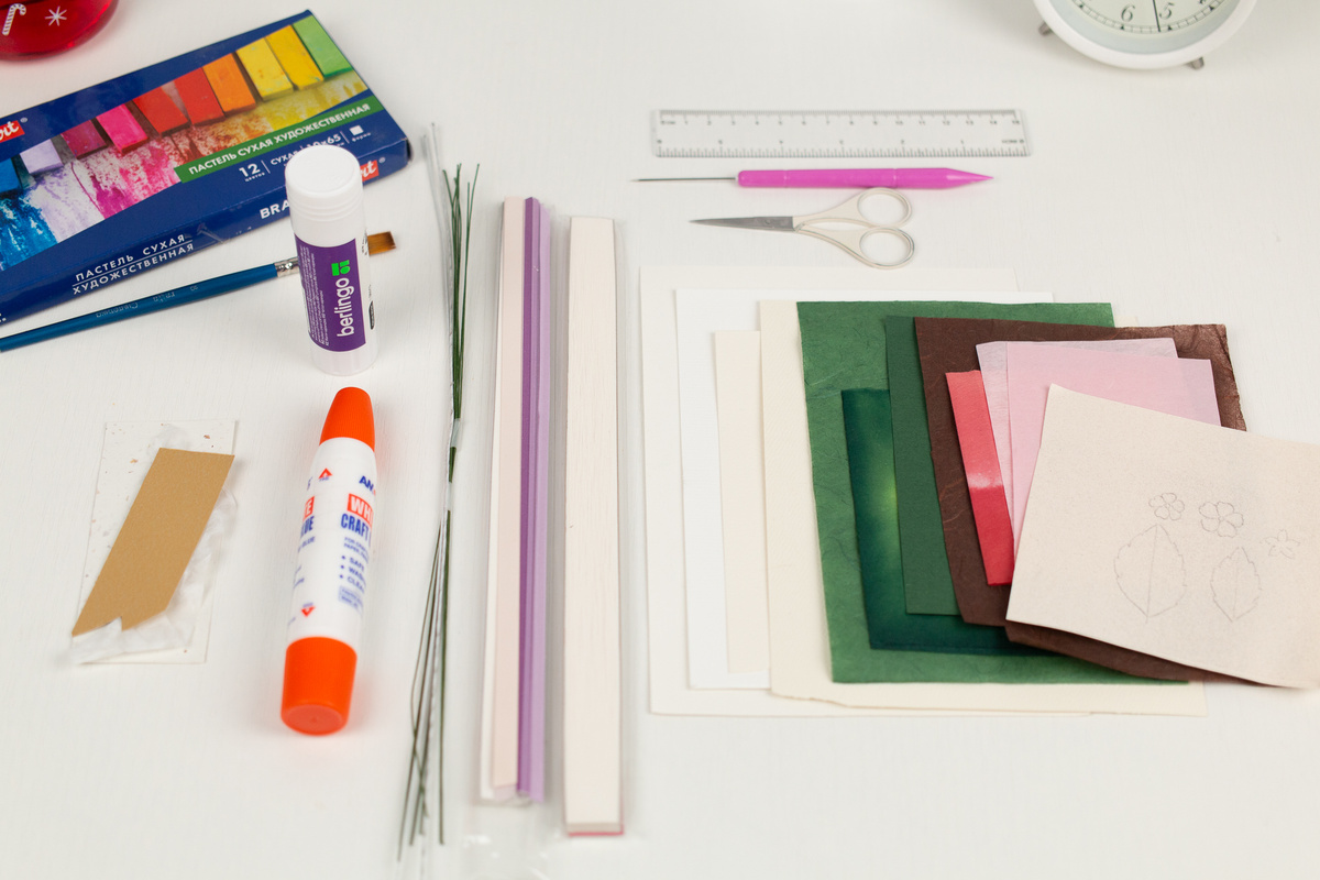 Материалы: белые полоски для квиллинга шириной 5 и 7 мм, светло-розовые полоски 5 мм, проволока, корейская традиционная бумага ханджи разных цветов и текстур, плотная бумага для свечи, пастель и блестящая акварель, перманентный маркер черного цвета, клей-карандаш и ПВА, шило, ножницы, пинцет, стек-булька, секатор для цветов (или чем вы режете проволоку).