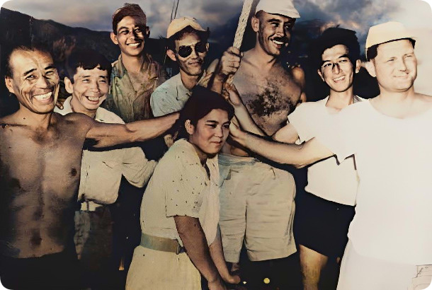 На берег сошли тридцать человек - двадцать рыбаков и десять солдат. Эти люди находились на японском рыболовецком судне, переделанном под перевозку боеприпасов. Американцы разбомбили корабль.