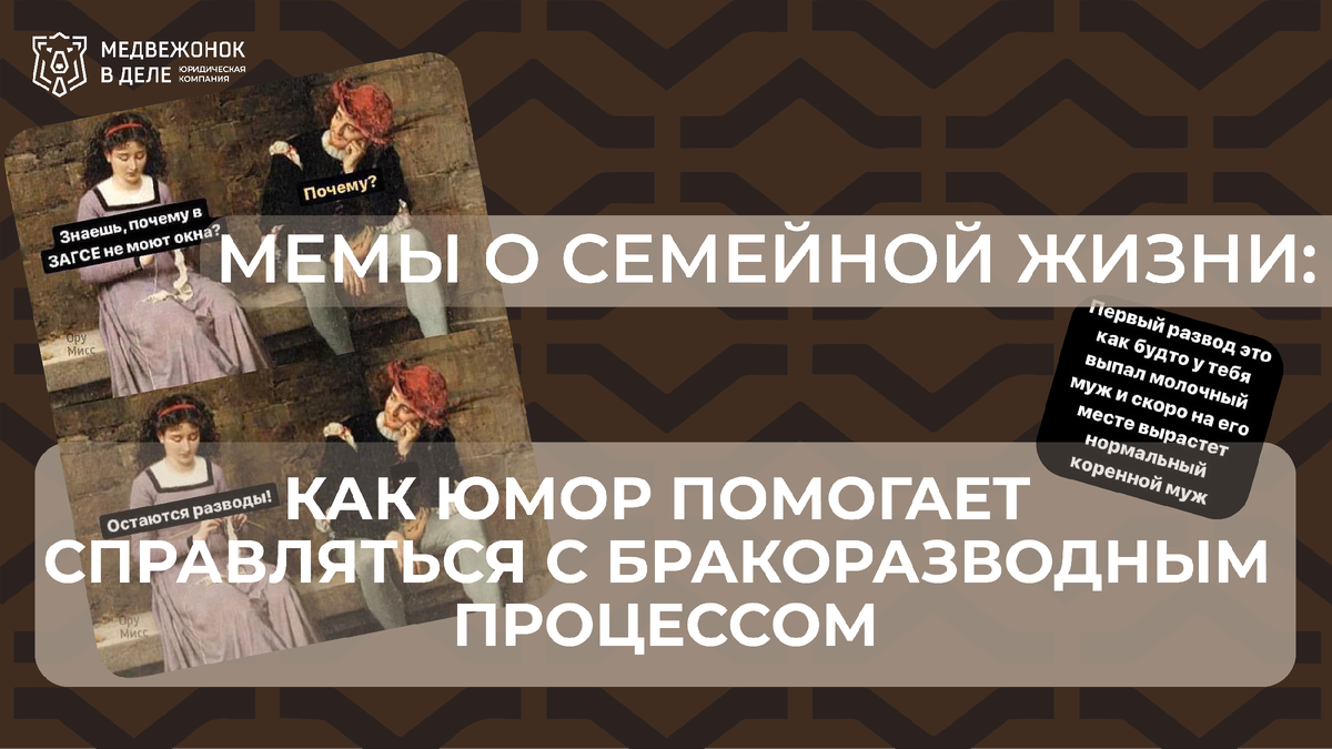 Развод — это стресс. Бумажная волокита, раздел имущества, эмоциональные качели… Но если взглянуть на ситуацию с другой стороны, можно найти в ней и кое-что полезное — например, вдохновение для отличных мемов! В интернете их тысячи: про адвокатов, суды, алименты, «ну и забирай свою PlayStation!» и вечную фразу «Дети остаются со мной». Но как шутки про развод помогают людям не сойти с ума в этот непростой период? И какие моменты законодательства стоит учитывать, даже если вы смеетесь? Давайте разбираться. ⸻ Психологи давно доказали, что юмор — мощный инструмент против стресса. Когда мы смеемся, организм вырабатывает эндорфины — естественные обезболивающие, которые улучшают настроение и помогают взглянуть на ситуацию иначе. Вот несколько причин, почему мемы могут реально облегчить процесс расставания: ✅ Помогают взглянуть на ситуацию со стороны. Иногда комичность момента можно увидеть только через шутку. ✅ Облегчают общение с друзьями и близкими. Не хочешь серьезных разговоров? Просто отп
