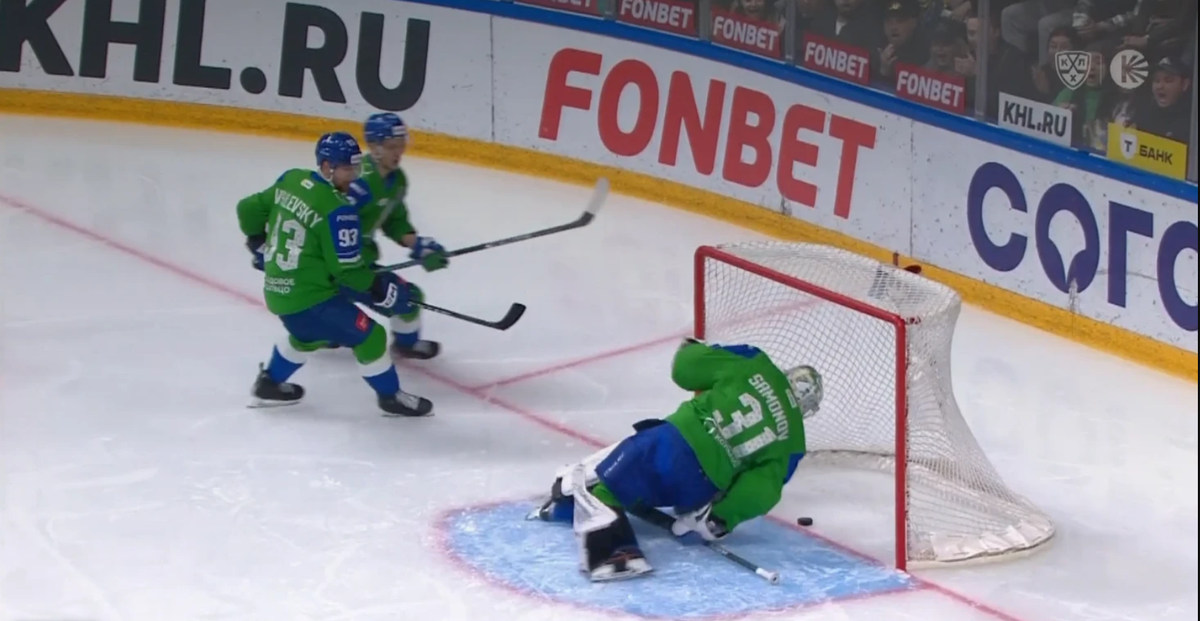 -Вратарь “Салавата” Александр Самонов не смог зафиксировать шайбу, она проскользнула между его щитками.