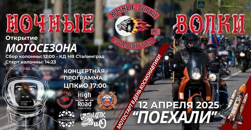 Как сообщили МТВ.ОНЛАЙН в мотоклубе «Ночные волки» отделении «Сталинград», традиционно мотосезон «Поехали!» начнётся 12 апреля, в день космонавтки. В эту дату более двухсот байкеров на их железных конях, украшенных флагами и символикой, проедут колонной по главным улицам и проспектам Волгограда: от КД НВ Сталинград, находящегося на проспекте Ленина, 58/1, и до главной сцены ЦПКиО, где будет организована праздничная программа. Мероприятие включает в себя два основных блока: торжественный мотопробег «Поехали!» и праздничная программа в ЦПКиО. Первый блок: Маршрут движения следующий: ул. Глазкова → пр. Ленина → разворот на ул. Титова → пр. Ленина → ул. 7-я Гвардейская → ул. Хиросимы → ул. Рокоссовского → Мамаев курган (возложение цветов к монументу) → ул. Рокоссовского → ул. Хиросимы → пр. Ленина → ул. Зайцева → Финиш: главная сцена ЦПКиО. Второй блок начнётся в 17:00. Он включает в себя официальную часть, развлекательную программу, шоу, мастер-классы и активности, например, текст-драйв н