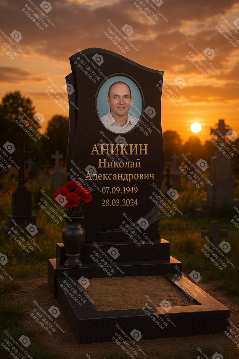 Это не просто памятник. Это — последняя нежность, обращённая к тому, кто был дорог. Кто ушёл, но остался в сердце. Остался в воспоминаниях. Остался здесь — в этой работе из камня, в этой чёткой линии формы, в этом взгляде с фотографии. Перед вами — памятник из тёмного гранита с изогнутой стелой, воплощение строгой красоты и вечной любви. Портрет выполнен на фарфоре, запечён в печи при экстремальных температурах, что делает его невосприимчивым к дождю, солнцу, морозу. Он утоплен в стелу, оформлен ручным полированным фацетом — изящное обрамление, которое подчёркивает его глубину и важность. Надписи — накладные, изготовлены из нержавеющей стали с покрытием нитрид титана, цвет золота не тускнеет, не облупится, не исчезнет даже через десятилетия. Это не краска — это металл, как купола храмов, стоящих веками. Ваза из гранита, наполненная живыми гвоздиками — маленький жест памяти, который всегда будет уместен. Форма стелы — плавная, тёплая, как душа человека, которого вы вспоминаете. Основа