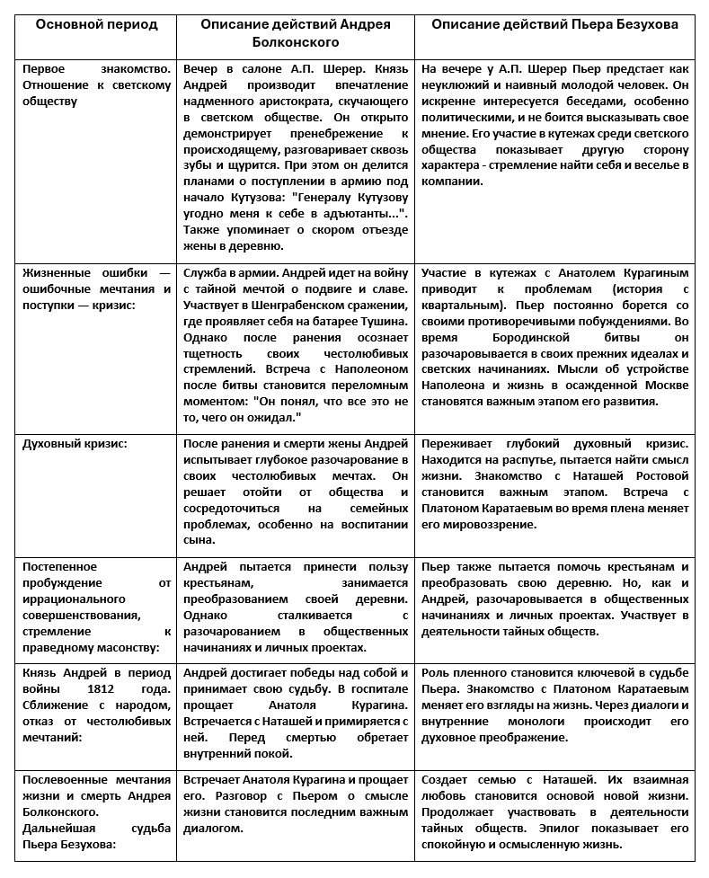 Духовные искания Андрея Болконского и Пьера Безухова в виде таблицы по различным периодам (роман Л.Н. Толстого «Война и мир»)
