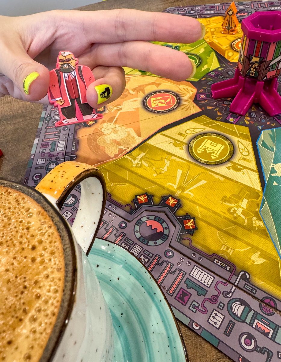 Плюс я выше не рассказала о том, что все агенты в игре прям конкретно асимметричные и имеют специализацию. И вот игра маркирует сложность игры за них от «легко» до «тяжело»: мы две последние партии играли с одним «тяжёлым» персонажем и одним «средним», а вот когда первую я играла за синего инопланетянина, который мог перемещаться, куда ему захочется, мы были крайне близки к победе.