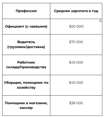 Для удобства мы собрали таблицу с зарплатами в США по некоторым профессиям: