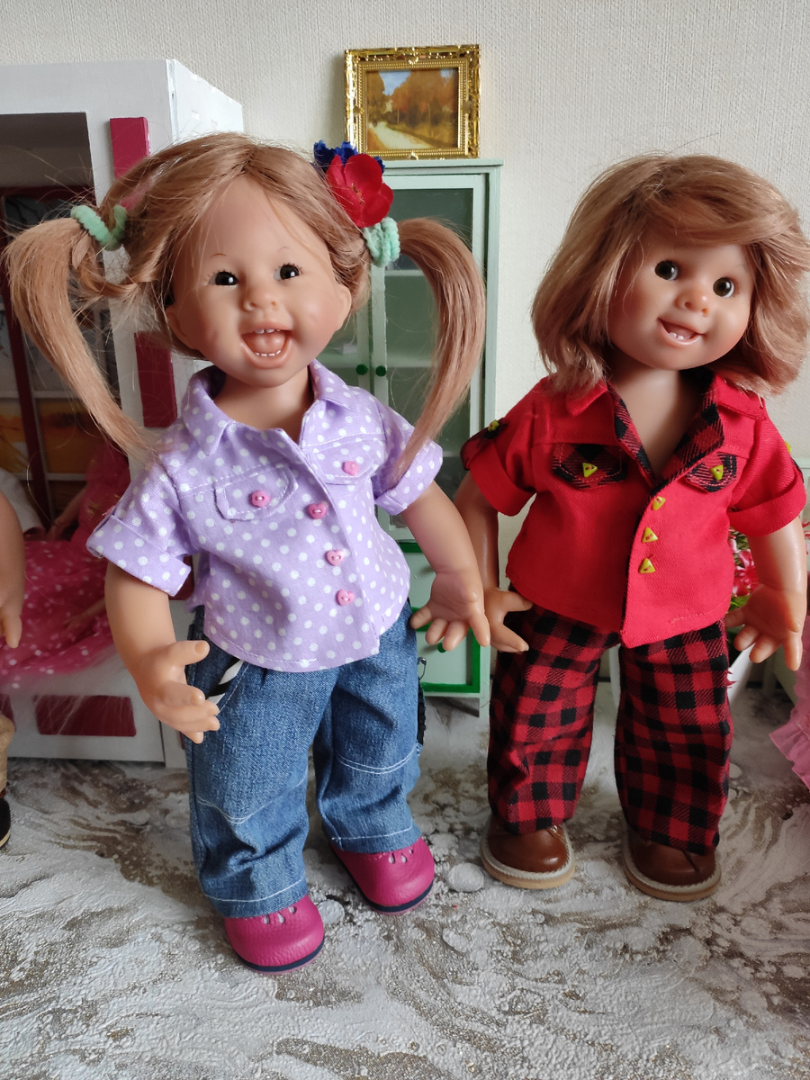 Всем привет!!! Продолжаю участие в челлендже "Яркие принты для любимых кукол" от Что хочу - то и ворочу! (заметки о творчестве и эта неделя посвящается нарядам в клетку. Порылась у себя в закромах и нашла пиджак новехонький. Раньше часто что-нибудь возьмешь, а потом это не нравится, так и с этим пиджачком было, была еще и юбка, но юбку дочка носила, а пиджак ей тоже не понравился. А куклам само то. Так из этой тканюшки сшились брюки для Барри, мы в них ходили на день рождение Здесь можете посмотреть как прошел праздник А сегодня дошила юбку и кофточку для большой моей куколки Маши. Пиджак был отрезной по талии и с воланом, вот из этого волана и получилась юбочка для куклы. О чем мечтаешь, Машенька? Вот было бы здорово, если бы еще сестрички приехали! Маша, возьми вот книжку и почитай. А то мечты всегда сбываются, а тем более кукольные. У Макса рубашка в мелкую клеточку Первый мой пиджак тоже в клеточку Ну и самая моя большая девочка в платьишке в клеточку (платье фабричное). Но пусть т