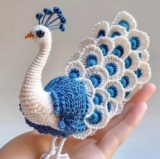 Materials • Cotton ricorumi (blue, navy blue, green, beige) • Crochet hook size: 3 mm • Yarn needle • Fiberfill for stuffing • Safety eyes (5 or 6 mm) • Stitch marker • Scissors Abbreviations Rnd: Round MR: Magic ring Ch: Chain Sl st: Slip stitch Sc: Single crochet Inc (прибавка): Increase Dec: Decrease Hdc (убавить полуст. с накидом): Half double crochet ( )*: Repeat till the end of round [ ]: Total number of stitches in the roundAMIGURUMI PEACOCK FREE PATTERN Head and Body In blue.