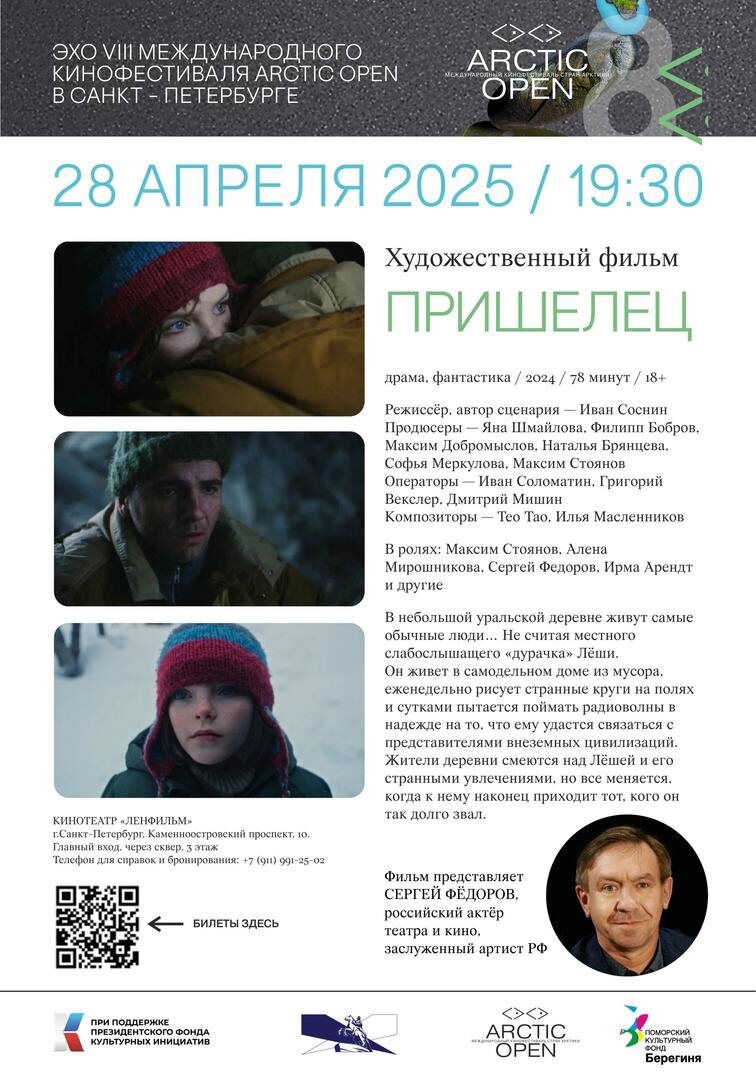 📍28 апреля в 19:30 программа начнется с фильма «Пришелец» (18+) Ивана Соснина, получившего на архангельском кинофестивале приз в номинации «Лучший сценарий игрового полнометражного фильма».