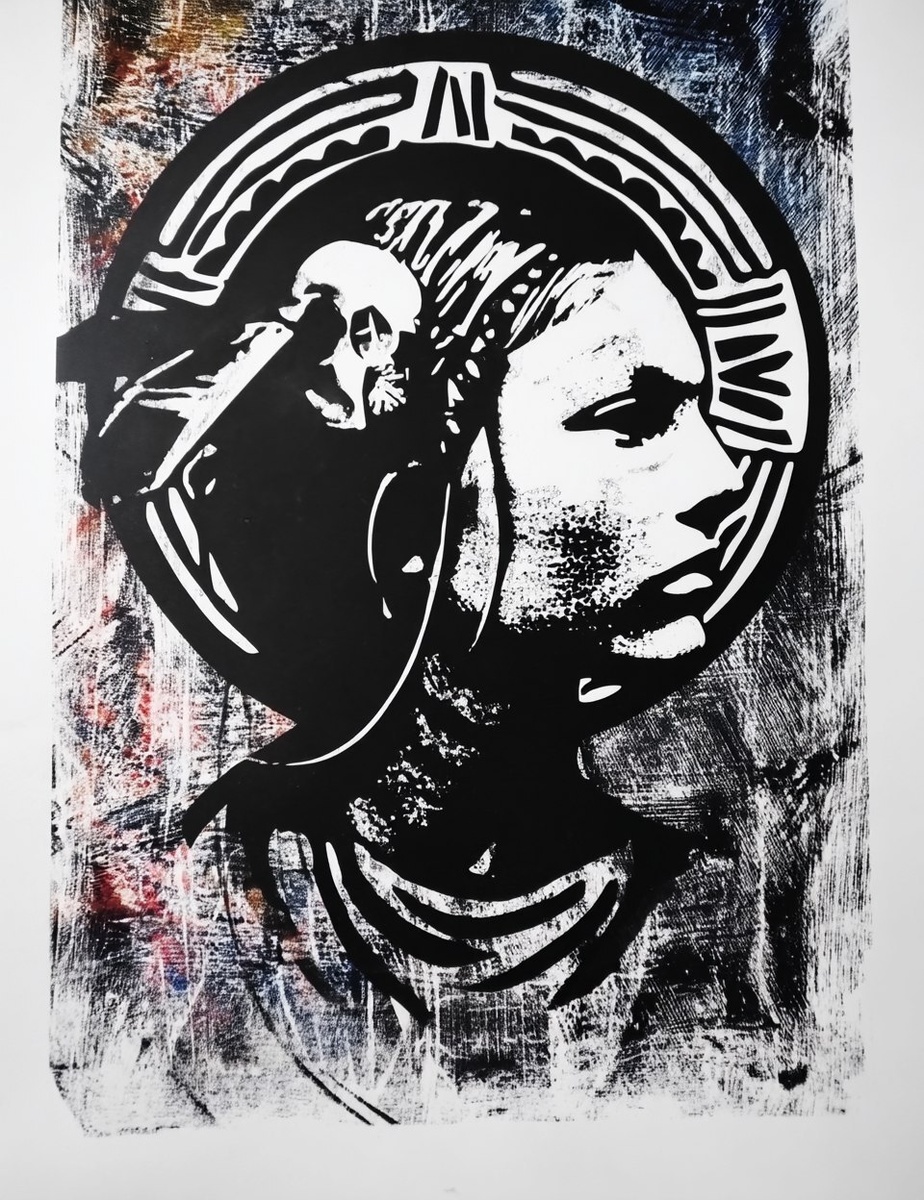 Создано на основе запроса: black and white screenprint poster of a bold black ink stamp, linocut, pagan, radical, hippie punk feminist white woman, stencil, black and white, photocopy.