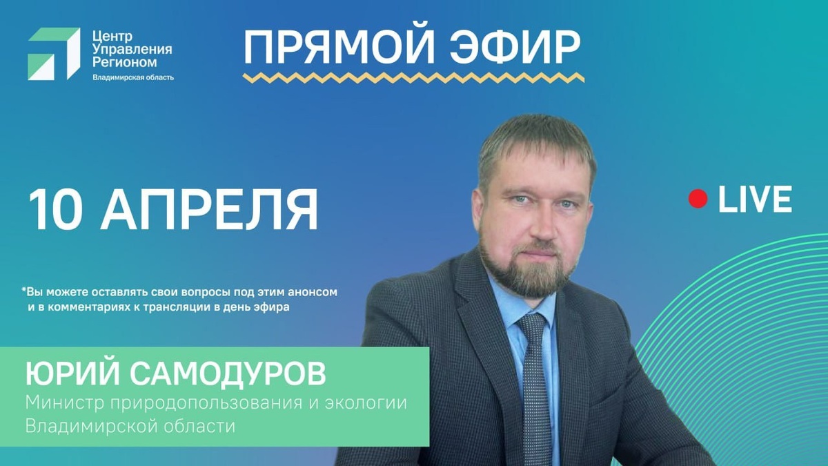 В четверг, 10 апреля, гостем студии ЦУР станет министр природопользования и экологии Владимирской области Юрий Самодуров. Обсудим обращение с ТКО и раздельный сбор мусора. Поговорим о том, какие мероприятия по очистке рек будут проведены в этом году.