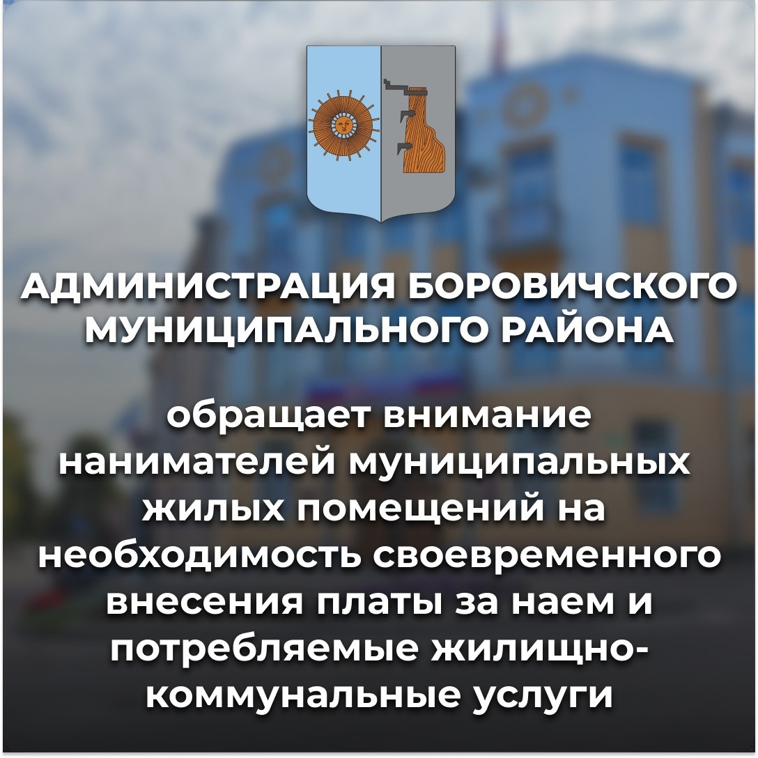 ⚡ Администрация Боровичского муниципального района обращает внимание нанимателей муниципальных жилых помещений на необходимость своевременного внесения платы за наем и потребляемые жилищно-коммунальные услуги, а также на необходимость соблюдения условий договоров социального найма.
