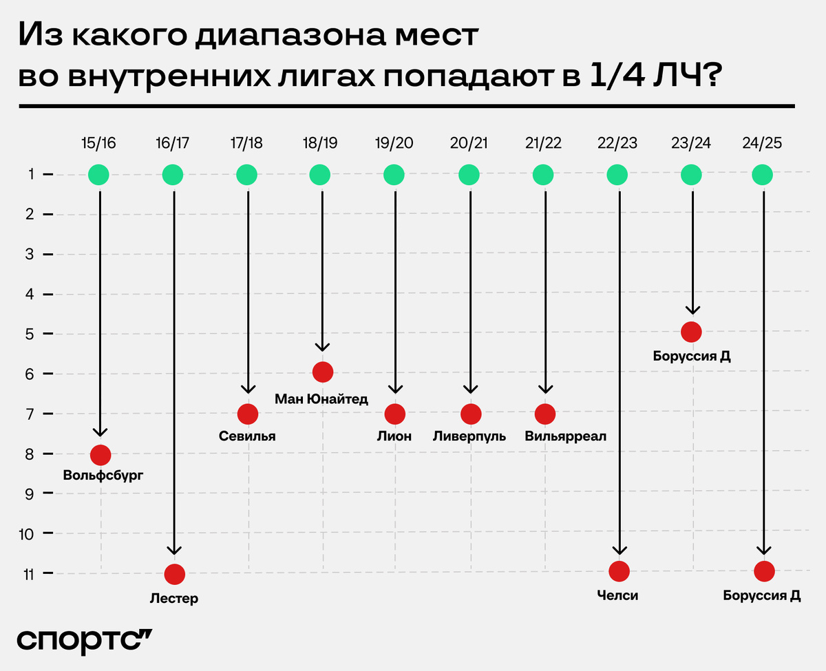 В четвертьфинал Лиги чемпионов-2024/25 неожиданно попали команды с неприлично низких для этой стадии мест во внутренних чемпионатах. На момент прохода «Астон Вилла» шла девятой в АПЛ, а «Боруссия» – 11-й в Бундеслиге. Но насколько этот случай уникален? Для ответа мы зафиксировали команды-участницы 1/4 ЛЧ с самыми низкими позициями в лиге за последние 10 лет. При подсчете учитывалось место команды в чемпионате на момент прохода в 1/4, а не на дату первой игры четвертьфинала. ● Само по себе 11-е место в лиге в четвертьфинале ЛЧ – не чудо, хотя за последние десять лет это только третий случай. Во всех трех примерах жеребьевка в 1/8 была щадящей: «Лестер» прошел «Севилью», «Челси» – «Боруссию». Сам же Дортмунд в этом году получил в оппоненты «Лилль».● Если 11-е место чемпионата в 1/4 ЛЧ не новость, то связка «девятое плюс одиннадцатое место» за последние 10 лет встречается впервые. В сезоны с «Лестером» и «Челси» с 11-х мест, командами со второй самой низкой позицией в лиге были… клубы с т