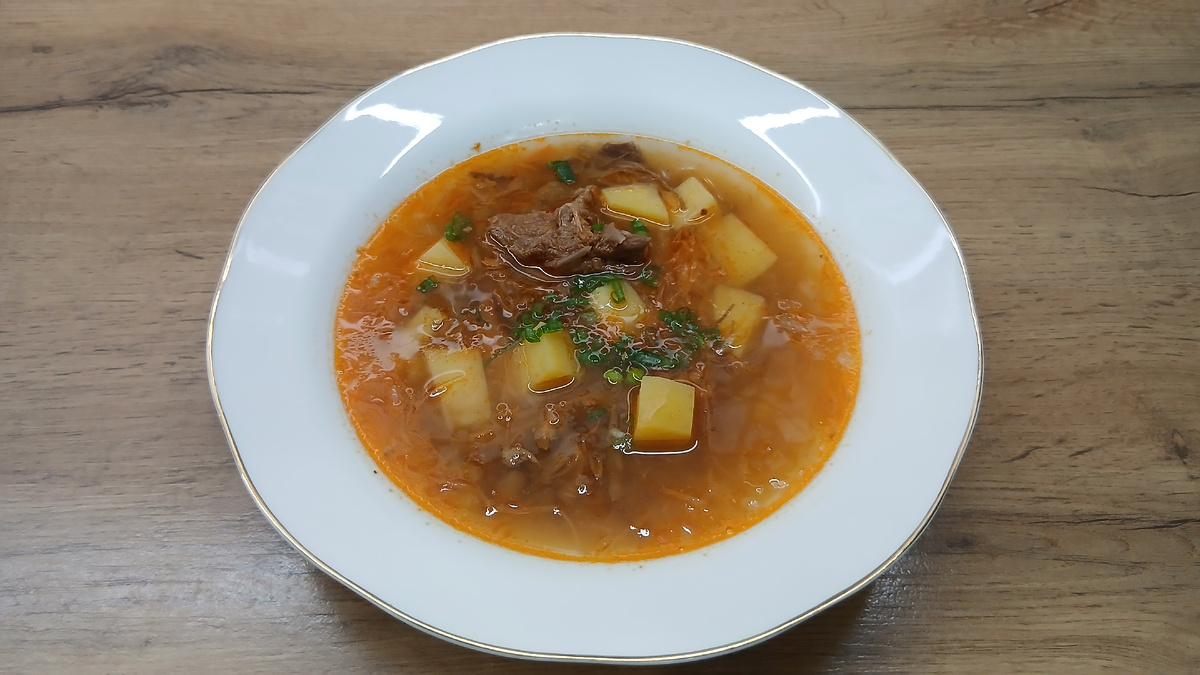 Сегодня приготовим щи из квашеной капусты с тушёнкой. Очень вкусное блюдо, приготовление которого не отнимет у вас много времени, а результат приятно удивит. Главное использовать качественные ингредиенты и всё получится! В рецепте я использовала говяжью тушёнку, но подойдёт любая (свиная или из индейки), вкуснее всего конечно готовить из тушёнки домашнего приготовления. Для приготовления подготовим все ингредиенты заранее, так как щи готовятся очень быстро. Картофель 3 шт.; Лук 1 шт.; Квашеная капуста 300 г; Тушёнка 325 г (1 банка); Лавровый лист 2 шт.; Томатная паста 2 ст. л.; Вода 2 л. Кастрюлю, в которой будем варить щи, ставим на средний нагрев. Добавляем в неё жир из тушёнки (масло в рецепте не используем) и ждём, когда он расплавится. Тем временем кубиком нарезаем лук. Добавляем его в кастрюлю и слегка обжариваем. Лук стал прозрачным, самое время добавить томатную пасту! Не забываем перемешивать! Томатная паста обжарилась, появи