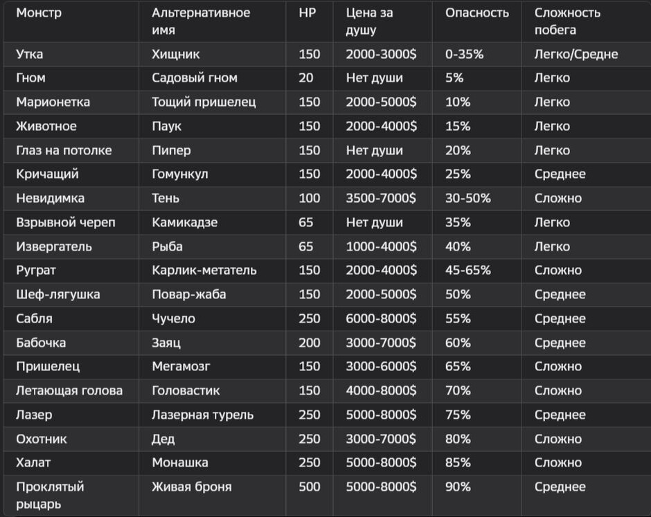 Часто в R.E.P.O возникает необходимость устранить мобов, чтобы получить лишние деньги для квоты, или освободить путь. Именно для этого в своей статье я подготовил тутор, как можно контрить разных мобов Утка Осторожно обходите её. Дождитесь 10 секунд, чтобы утка вернулась в спокойное состояние. Окуните утку в зелёный котёл. Смойте её в унитаз. Подведите под пресс на станции переработки. Гном Разбейте его о пол или стену с помощью гравитационного луча. Используйте любое оружие. Тонкий человек Не смотрите на него дольше двух секунд. Уничтожьте его любым оружием. Животное Игнорируйте его или атакуйте любым оружием. Пусть двое игроков одновременно схватят его, чтобы он притворился мёртвым. Глаз на потолке Нарушьте визуальный контакт с глазом, спрятавшись за предметами или покинув помещение. Кричащий Используйте любое оружие. Будьте осторожны в борьбе с группой кричащих. Невидимка Освобождайте захваченного союзника. Избегайте других врагов, пока освобождённый игрок оглушён. Взры