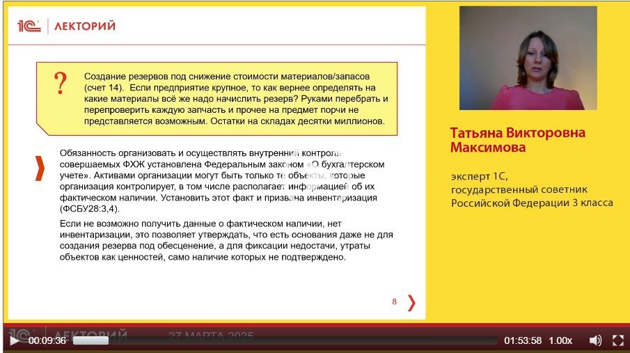 ❓Создание резервов под снижение стоимости материалов/запасов (счет 14). Если предприятие крупное, то как вернее определять на какие материалы всё же надо начислить резерв? Руками перебрать и перепроверить каждую запчасть и прочее на предмет порчи не представляется возможным. Остатки на складах десятки миллионов. на этот и другие вопросы ответила Татьяна Максимова, государственный советник 3 класса, эксперт фирмы 1С в лекции на тему Обязательное применение ФСБУ 28/2023 «Инвентаризация» с 1 апреля 2025 года: проверка готовности Отзыв слушателя: Спасибо за семинар, слушать лекцию всегда интереснее и познавательнее, чем самому читать документы. тем более присутствуют вопросы и ответы на них. 👉 Смотрите бесплатно полную видеозапись лекции! 🚨Подписывайтесь на @lector_1c