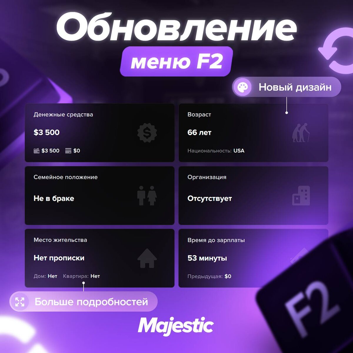 ⚙️ Обновление меню F2 — главное о вашем персонаже в одном разделе Новый стильный интерфейс и расширенные вкладки позволят легко отслеживать каждый шаг вашего игрового пути: • В разделе «Основное» отображаются банковские средства, все виды имущества, а также имя супруга или супруги. • Обновлен алгоритм подсчета доходов и расходов для более точного отображения статистики. • «Статистика» дополнена информацией об активных судимостях и предупреждениях. • Вкладка «Транспорт» дополнена информацией о стоимости утилизации, установленном тюнинге и максимальной скорости. • Во вкладке «Имущество» теперь указаны вместимость склада, количество гаражных мест и уровень улучшений. • «Навыки» расширены описаниями всех умений и профессий персонажа. 👉 Обновленные данные уже доступны в игре — заходите в раздел «F2 >> Персонаж». ❤️ Majestic Role Play