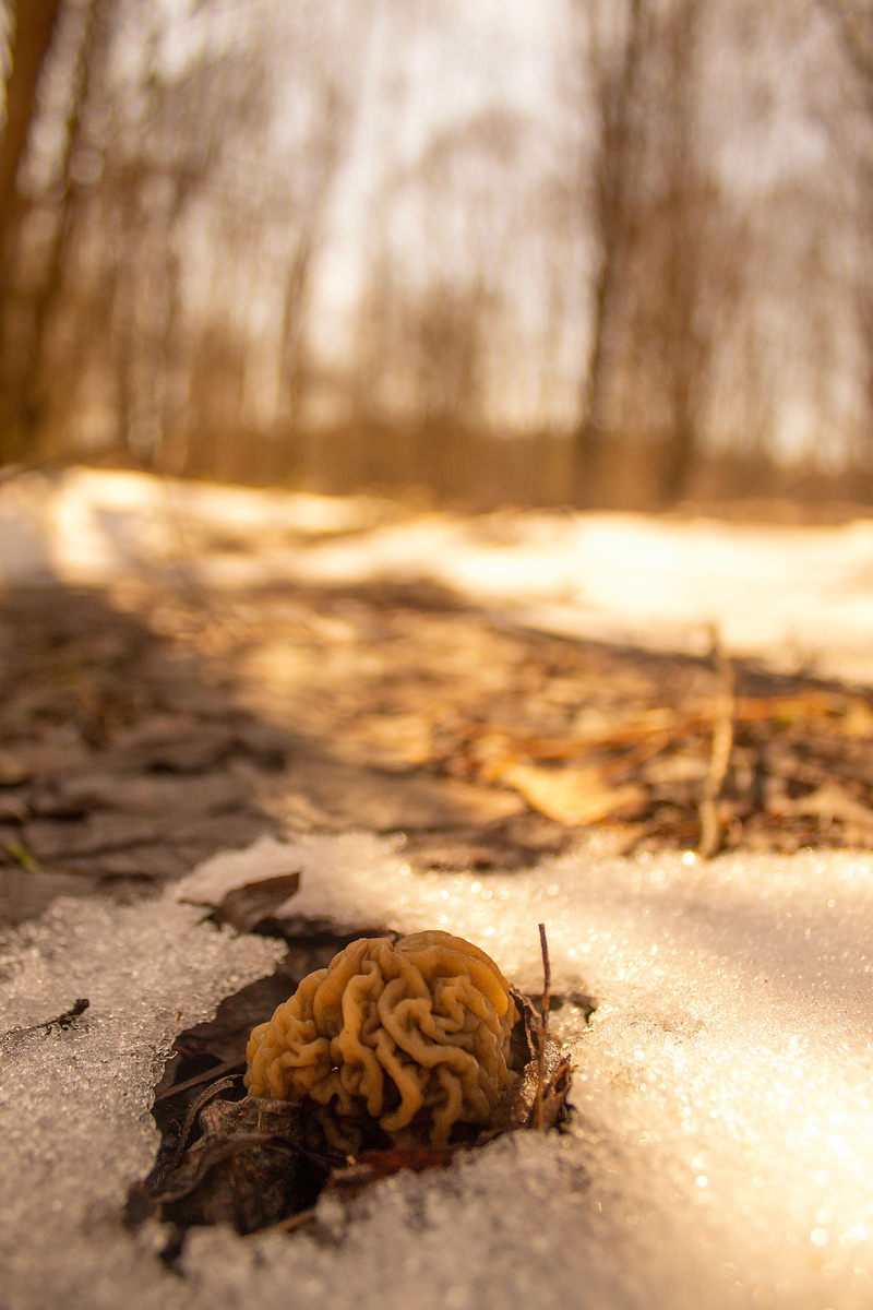 14.04.25 город только-только освободился от снега, а в лесу ещё лежат "почти сугробы". Ну и что с того? А ну как сходить за грибами! И это вовсе не безумие, или глупость. Дело в том, что запорошила зима совершенно неурочно на уже весеннюю прогретую почву и логично было предположить, что народившиеся сморчковые шапочки вполне могли перезимовать под налетевшим до морозов покрывалом, ну, и дождаться нас. И, конечно, манила возможность запечатлеть эту магию - "снег и грибы".