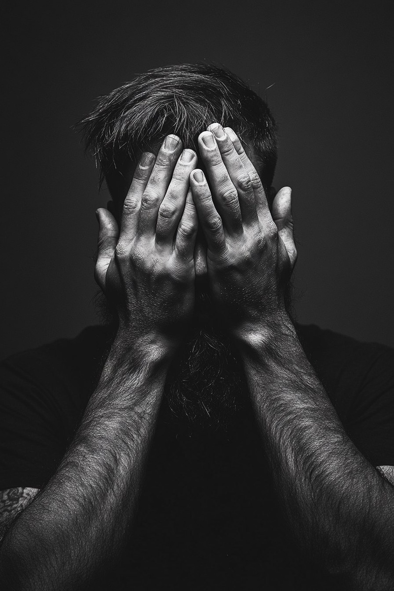 Создано на основе запроса: Hands covering face, a screaming man with a beard, photography in the style of high-contrast black and white