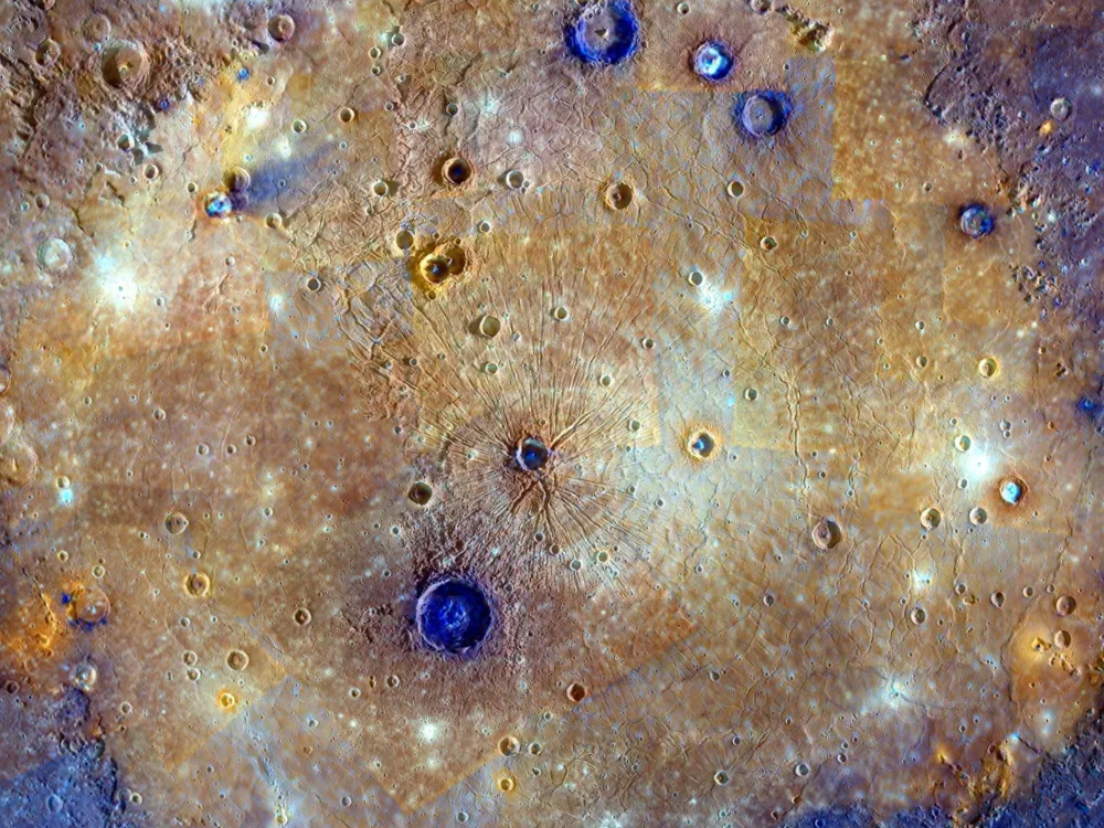- Вулканические жерла — например, ярко-оранжевая зона в районе Caloris Basin указывает на выбросы сернистых газов.