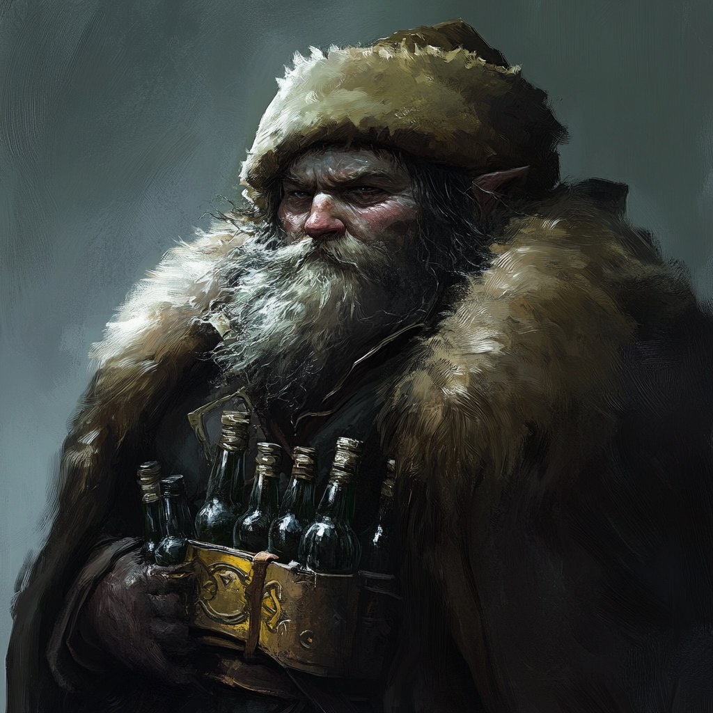 Создано на основе запроса: DnD portrait, medieval style, Small, broad, soot-smeared face, wearing a thick fur hat and a belt full of empty