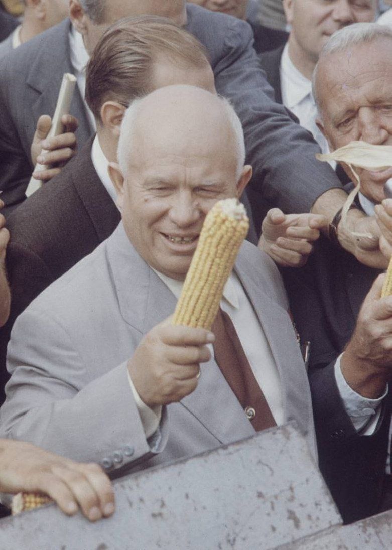 15 апреля 1894 года родился Н. С. Хрущев. Его правление запомнилось освоением целины и массовым посевом кукурузы, из-за чего зерно пришлось покупать зерно в Канаде. Были ликвидированы МТС, сократились приусадебные хозяйства колхозников из-за налогов на деревья, уменьшилось количество крупного рогатого скота. Также провальным оказалась идея с Совнархозами. Придя к власти Хрущев отправил в отставку Маленкова, Кагановича и Молотова, а затем и Жукова. Берию расстреляли. Началась компания по осуждению культа личности Сталина. Хрущев объявил Сталина преступником. В 1991 Каганович подытожил: с опровержения Сталина началось опровержение Ленина и Маркса. Действительно, отказ от трудов Сталина негативно сказался на философии социализма, поскольку сталинизм являлся следующей ступенью развития марксизма-ленинизма. Также началась антирелигиозная компания. Но больше всего Хрущев запомнился передачей Крыма из РСФСР в УССР, против чего выступал Молотов. В 1991 году Каганович заявил: «Сталин в пос