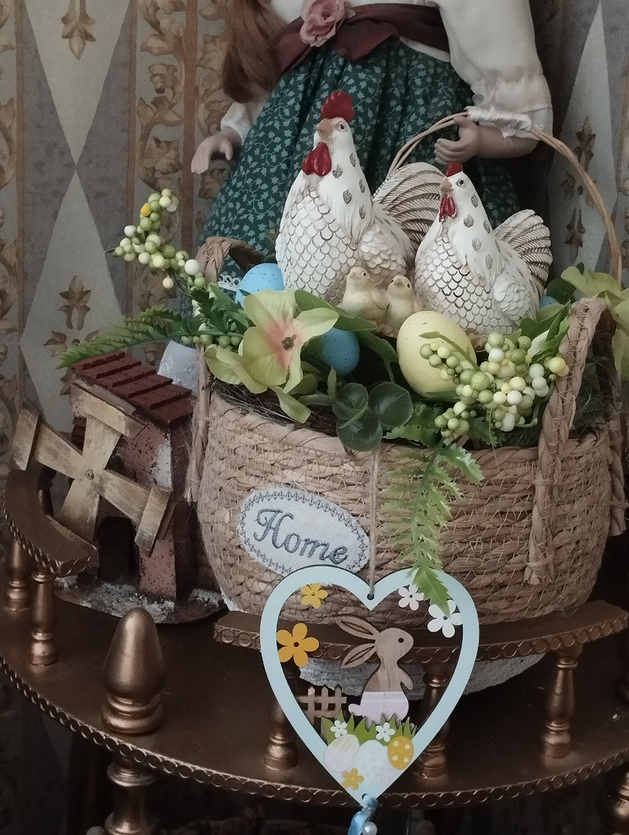 Семейство курочек в корзине я вам уже показывала. Но появилась новая деталь, которая очень сильно изменила всю композицию. Я решила в корзину положить венок. В прошлом году он висел на входной двери. Но сейчас декор в прихожей в розово-голубых тонах. Поэтому я решила использовать венок по другому. И даже подвесную декорацию с кроликом снимать не стала. Мне кажется, так ещё интереснее.