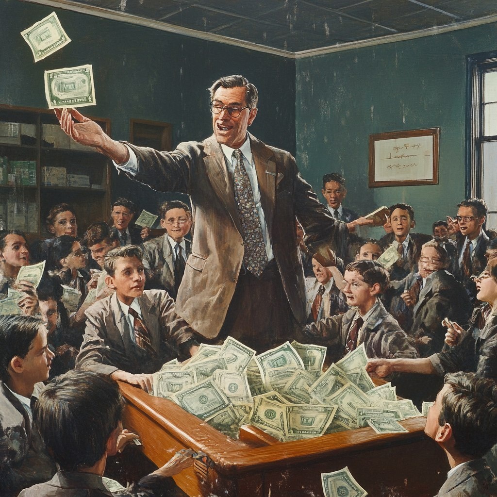 Создано на основе запроса: rich teacher, class room, show adults how to print money