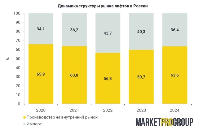 Согласно данным исследования "Анализ рынка лифтов в России: ретроспектива 2020-2024 гг, прогноз на 2025-2029 гг", проведенного компанией MarketProGroup, доля лифтов, произведенных отечественными компаниями, вновь увеличилась до 63,6% рынка после падения до 56,3% в 2022 году. Доля лифтов российского производства на рынке за последние пять лет была минимальна в 2022 году, что было связано с вводом санкций против российских компаний западными странами. Они обусловили разрывы логистических цепочек и перебои в поставках деталей и комплектующих, которые в значительном объеме используют отечественные производители в производственном процессе. Кроме того, в 2022 году часть компаний-производителей лифтов, чьи головные компании расположены в Западных странах, приостановили свою деятельность. Все это в совокупности обусловило существенное сокращение объемов производства лифтов внутри страны, как и доли отечественной продукции на рынке. В последующие годы российским компаниям удалось заново выстро